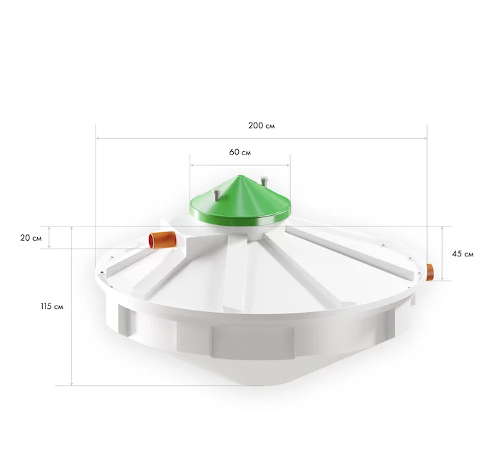 Диагональные стенки центральной камеры и корпуса сгущают взвешенные в воде частицы, и ускоряют процесс осаждения. Воды камеры биореактора и внешней камеры отстойника сообщаются через дно септика. В результате, на поверхности внешней камеры образуется осветленный сток, который перетекает в третью камеру.