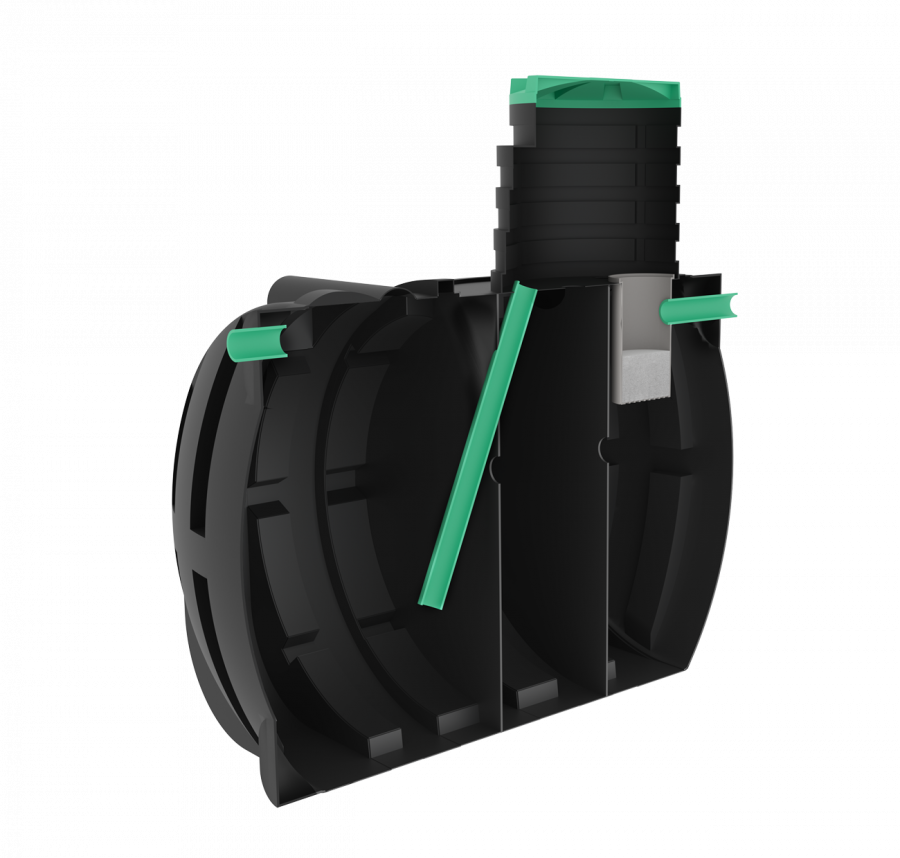 Все сточные воды, идущие от раковин, унитазов, посудомоечной и стиральной машин, направляются в первую секцию септика. В ней происходит отстаивание жидкости с выпадением на дно твердых частиц. Одновременно, на поверхности жидкости образуется пленка жира. Когда уровень жидкости достигает определенного уровня, она переливается через патрубок во вторую камеру. Патрубок устроен так, чтобы осадки и жировая пленка не перетекали в следующую камеру.