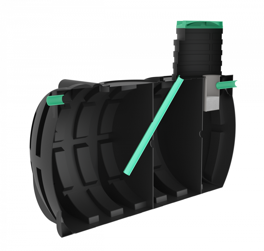 Все сточные воды, идущие от раковин, унитазов, посудомоечной и стиральной машин, направляются в первую секцию септика. В ней происходит отстаивание жидкости с выпадением на дно твердых частиц. Одновременно, на поверхности жидкости образуется пленка жира. Когда уровень жидкости достигает определенного уровня, она переливается через патрубок во вторую камеру. Патрубок устроен так, чтобы осадки и жировая пленка не перетекали в следующую камеру.