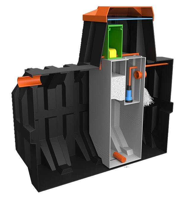 - блок-успокоитель или отстойник. Отсек предназначен для окончательной очистки стоков посредством оседания крупных частиц;