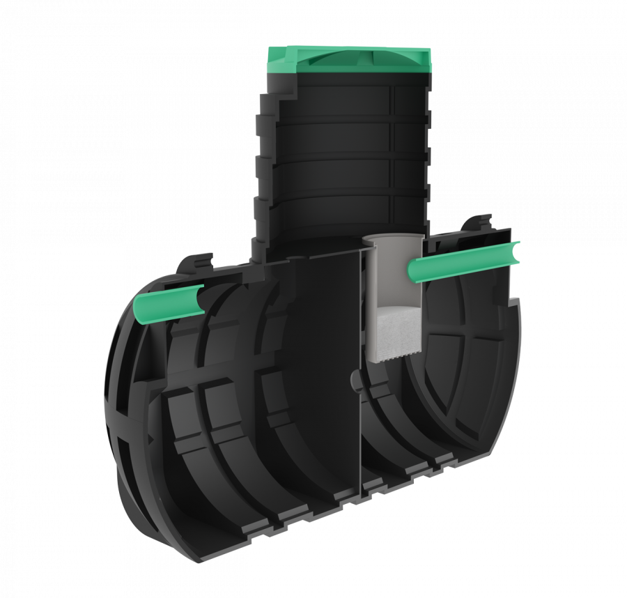 Все сточные воды, идущие от раковин, унитазов, посудомоечной и стиральной машин, направляются в первую секцию септика. В ней происходит отстаивание жидкости с выпадением на дно твердых частиц. Одновременно, на поверхности жидкости образуется пленка жира. Когда уровень жидкости достигает определенного уровня, она переливается через патрубок во вторую камеру. Патрубок устроен так, чтобы осадки и жировая пленка не перетекали в следующую камеру.
